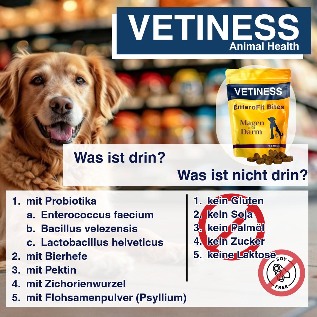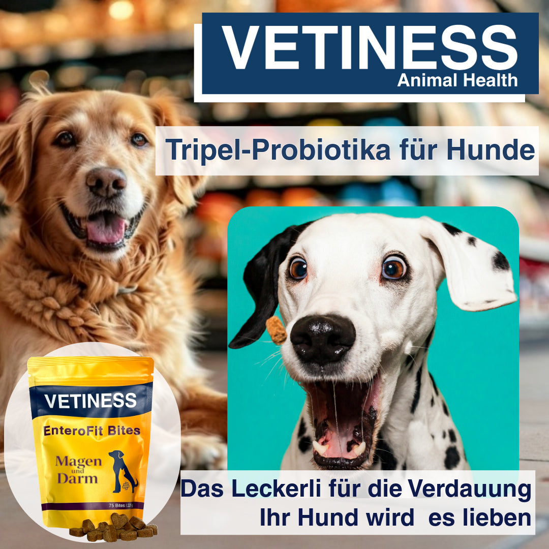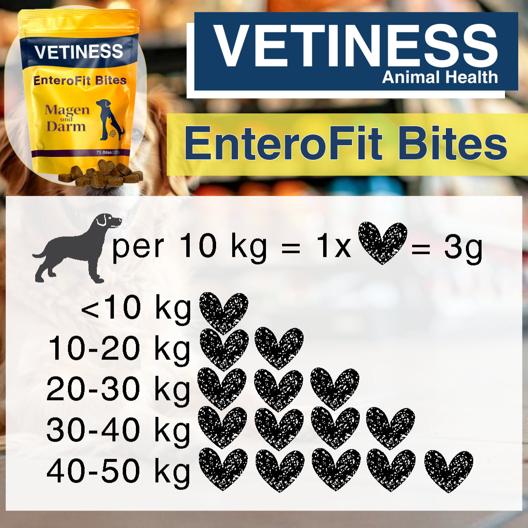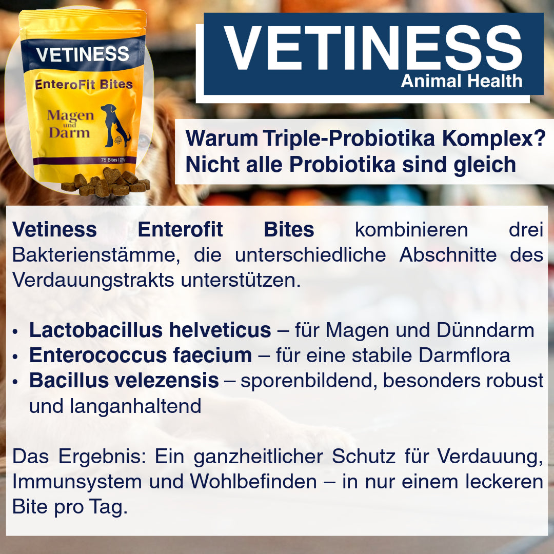 A healthy gut is the foundation for well-being – and this also applies to our four-legged friends. Vetiness Bites combine carefully selected probiotic cultures with natural ingredients to provide a small, daily portion of care. One bite per 10 kg of body weight – that's all it takes to do good.
